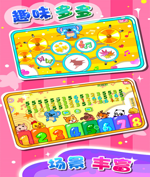 如今越来越多的家长逐渐认识到了音乐对孩子成长的重要作用,想让孩子能掌握一定的音乐技能,儿童宝宝学乐器集合了常见乐器分别是钢琴,木琴,架子鼓,古筝。1、木琴:木琴声音清脆悦耳,发挥你的音乐才华来为我们演奏一曲动人歌曲吧。2、钢琴:8个音符的任意组合,创造出快乐美妙的篇章。3、架子鼓:由五个鼓,两面吊镲组成.点击不同的鼓和镲,会有意外的惊喜哦!4、古筝:通过简单的5跟弦的组合弹奏出宁静悠扬的韵律。