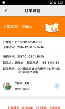 3.订单:订单类型时间等状态一目了然,筛选状态过后更清晰。下单成功后立刻分配工程师为您服务,对硬件设备订单等有疑问可直接与工程师电话沟通!
