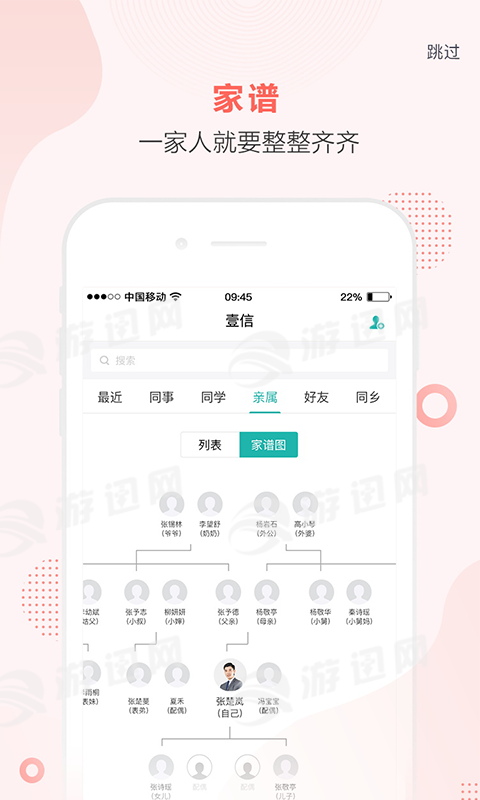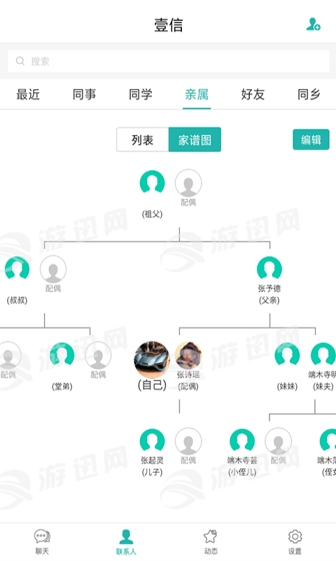 【家谱功能】壹信创新性的引入了家谱功能,在非常重视家文化的国内,此功能将能更贴心的服务于以家族为单位的客户群体,刮起一股壹信家谱风。
