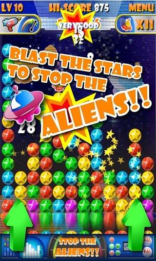 1、点击三个或更多的相同颜色的星得分;