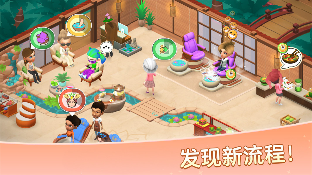1. 顾客需求匹配:玩家需根据顾客头像旁的提示图标(如按摩、美甲、理发等),将其引导至对应服务区。例如,携带“水疗”图标的顾客需被安排至温泉池区域,错误匹配会导致满意度下降。