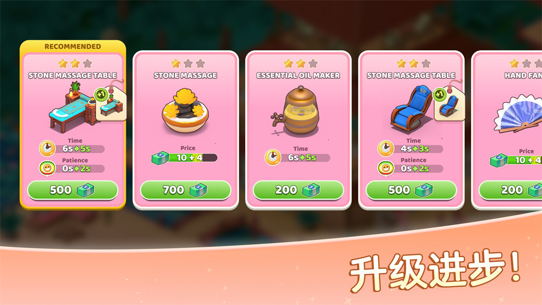 2. 员工协作系统:招募员工后,可通过“培训”功能提升其技能等级。高级员工可缩短服务时间,如将普通按摩师的10分钟服务缩减至7分钟,显著提升客流量处理能力。
