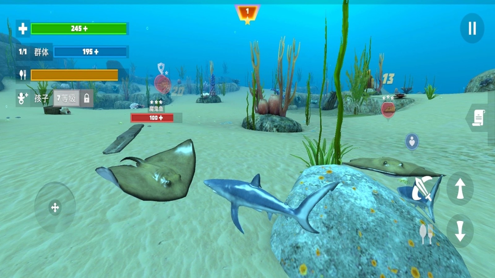 4. 繁衍系统:支持鲨鱼交配繁衍,后代可继承部分特性,如速度、攻击力或特殊技能,为长期养成增添策略性,玩家需平衡捕食与繁衍资源分配以优化种群基因。
