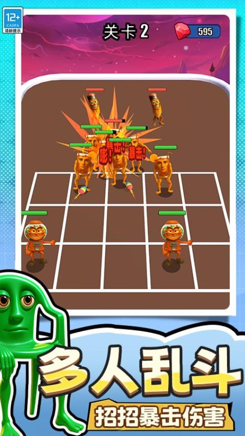 2. 策略性角色合成系统:通过合并相同低级怪物(如“绿色椅子人”)进化出高级战士,不同角色拥有独特技能(如范围攻击、临时护盾),需根据敌人类型(火焰发射炮、多连发导弹)合理搭配阵容,形成属性克制链。