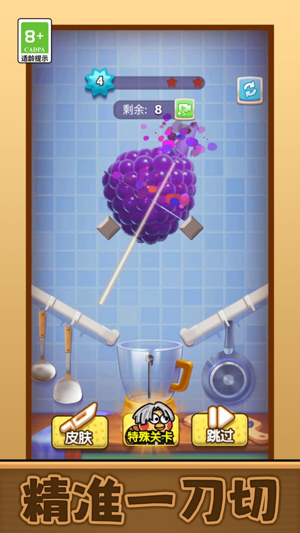初始刀具切割范围小,易漏切水果。建议前10关优先积累金币,解锁“宽刃刀”(切割范围+30%)与“双刀流”(同时切割两个目标),大幅提升订单完成效率。