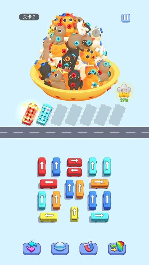 4. 道具系统:提供“刷新车辆颜色”“吸铁石吸螺丝”“重置关卡”等实用道具。其中,“吸铁石”可一次性吸取场景内所有同色螺丝,显著提升通关效率;“刷新道具”则能重新排列车辆颜色,帮助玩家突破卡关困境。