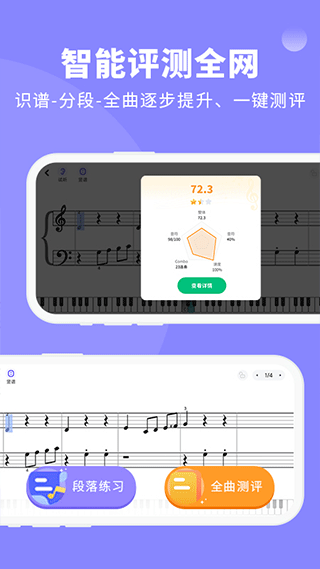 3. 技术支撑:依托自研机器学习琴声识别引擎,软件在复杂环境下的识别准确率达98%以上,同时支持无级调速跟奏,满足用户个性化练习需求。