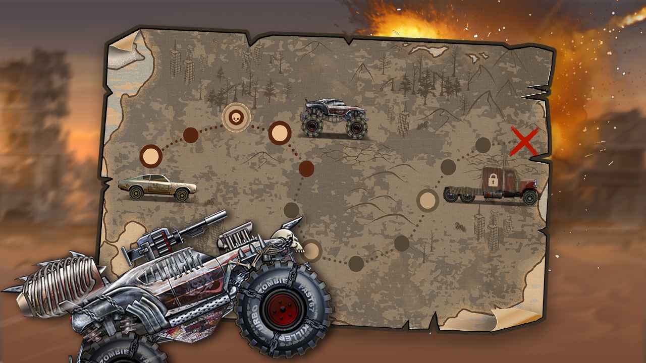 2. 战车深度改装:通过金币升级护甲、机枪、燃料箱、重量、发动机、传动、喷射装置、轮胎等8大部件,例如升级轮胎可增强抓地力,安装火箭喷射器可实现紧急突进,配置机枪可远程消灭僵尸。