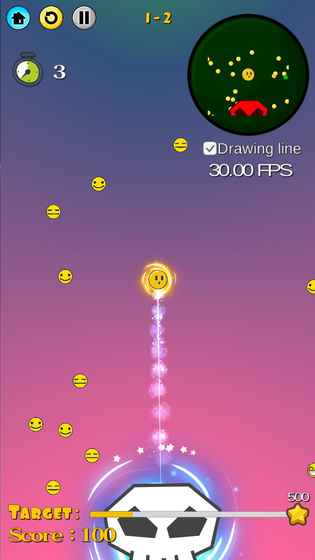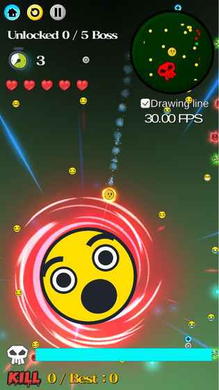 游戏是表情球球,分关卡模式和boss模式,关卡模式是通过控制表情球收集星星,收集到一定星星就开启boss模式,打boss的时候,要保持主角球,不要碰到boss,尽量躲避绿色毒球,尽量多打红色表情球,去攻击boss。