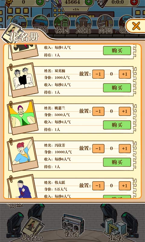 这是一款纯挂机类小游戏。内容超简单超轻量,轻量到我不知道要怎么写简介,试着解锁更多广场舞阿姨和叔叔,用人气来拯救河滨广场吧!未来会有更多魔性的图鉴更新哦。