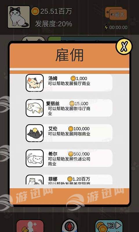猫咪商业帝国是一款轻松好玩的模拟经营类游戏,玩家化身成一只可爱的小猫咪,经营自己的小餐厅,逐渐扩大规模,成就商业帝国,喜欢的小伙伴赶快来吧!