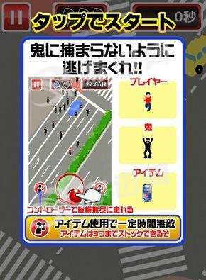 简单易上手的休闲小品,玩家在游戏中扮演一个在涉谷逃亡的人,后面有一大堆警察在追捕,只要玩家在逃亡期间捡到道具就能在一定时间内无敌,被抓到则会直接GAME OVER。
