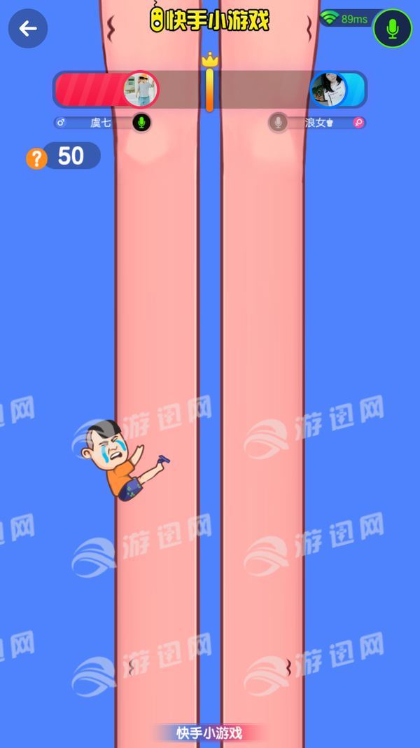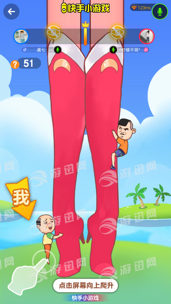 3、躲避障碍物不断继续爬升,先比对手爬到女生身边则游戏获胜