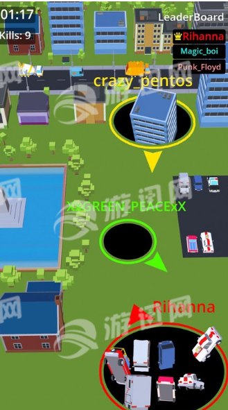 想要获得高分的话,操作的就必须有侵略性,开局正常吃这些小车子,树、路灯这样的东西,等我们的黑洞体积大一些了,就赶快去吞噬其他玩家的黑洞,这样才是成长最快的方法。