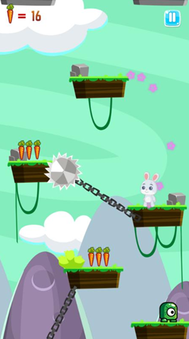 是一款向上跳跃题材的兔子冒险游戏,小白兔真可爱,蹦蹦跳跳向上爬,想要收集更多的胡萝卜,不仅要面对齿轮陷阱,而且还有凶残的小怪兽,玩家操纵小兔子移动,踩死小怪兽,将所有胡萝卜统统割掉。