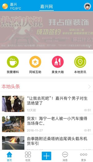 app是嘉兴本地社交生活圈应用app,app拥有最新嘉兴本地资讯、社交活动、当地美食、本地生活楼市资讯、居民互动交流的平台。另外app还提供网友爆料、吐槽、出行结伴、发布二手出租出售、求助、求租信息、便民工具、在线挂号等服务,欢迎下载体验。