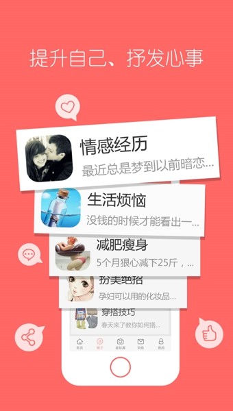 国内最大的女性私密社区,女生提升自己、抒发心事的交流平台!""的姐妹正在交流:情感经历、生活烦恼、减肥瘦身、扮美绝招、穿搭技巧、生活小常识、育儿经验....另外,“虚拟屋” 每天发布新玩法:虚拟换发型、免费艺术照、奇幻古装秀、虚拟试新衣!100多万姐妹在等你,参与一下吧!