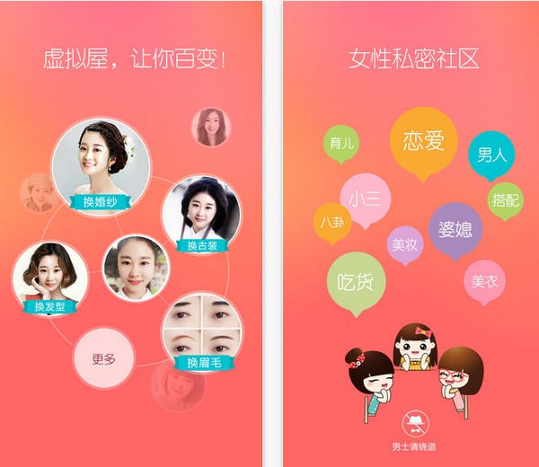 以女性社区为切入点,用户可自发根据自己的兴趣建立属于自己的圈子,同时也为女性提供虚拟屋尝试虚拟换发型、免费艺术照、奇幻古装秀、虚拟试新衣等功能。