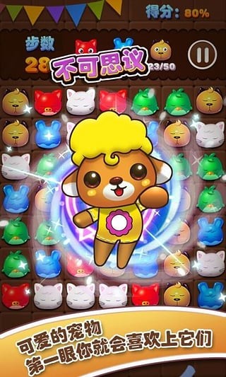 玩家只需点击两个或两个以上颜色相同的宠物方块即可消除。没有时间限制,每个阶段都有一个目标,完成即可进入下一关。简单轻松的治愈系游戏,看着小宠物们被不断消除,真的有一种带走疲惫的感觉。