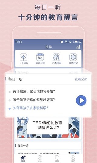 3、达人课:达人们精心打造的系列课程,涵盖亲子家教、英语、艺术和科学等领域,为孩子开启不一样的教育之旅。