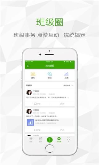 班级圈:教师在班级圈内可以发通知、发投票、审批学生请假单,还可以分享班级趣事,与家长、学生进行互动;