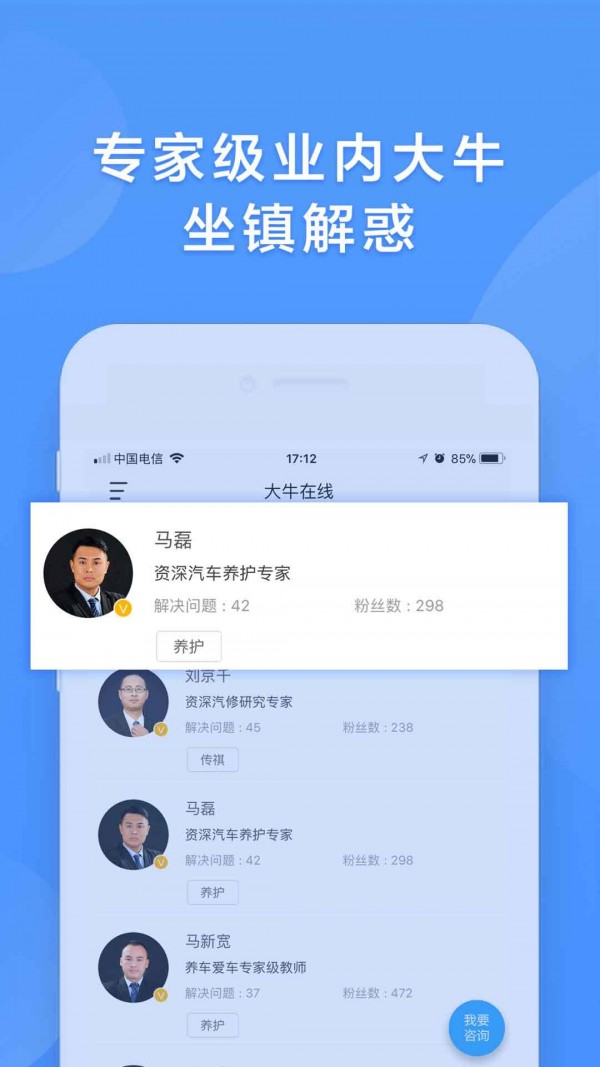 邀请从事汽修行业多年的权威大牛坐镇解惑,用户可在“大牛在线“板块选择指定大牛来解答疑惑,且会定时更新统计每位大牛解决过的问题总数和粉丝总数,供用户快速选择参考。