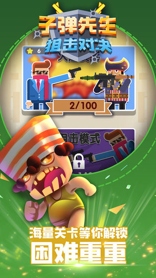 子弹先生狙击对决是一款休闲娱乐的物理射击闯关游戏。玩家在游戏中饰演炫酷的子弹先生,使用你手中的枪械无趣,利用物理折射等原理,消灭敌人,完成各项挑战。