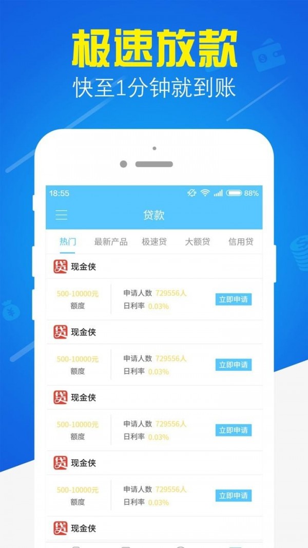 1、放款快速: 门槛很低,线上申请只需3分钟,自动化配合审批通知,快至1小时放款,支持同时申请多款产品;