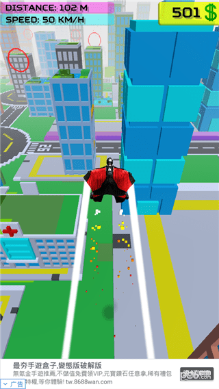 游戏你将穿上非常高科技防水且轻盈的飞行服,在非常繁华的城市中进行冒险!需要穿过高楼大厦在城市的高楼之间进行滑行。