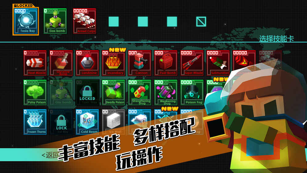 塔防游戏中融入卡牌元素,以技能卡搭配策略替代传统建塔升级,以释放技能卡多维度技巧来替代传统塔防的枯燥过兵。