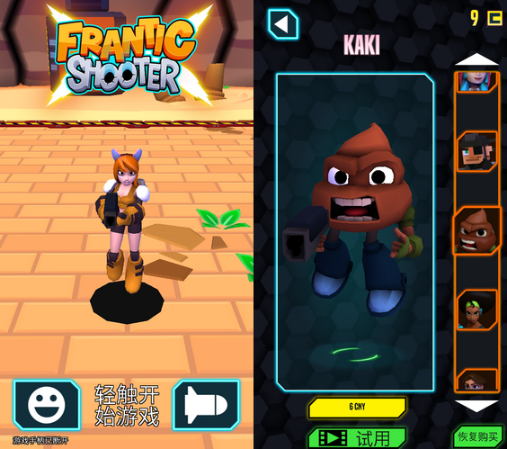 游戏的界面总体来说设计的还是比较不错的,角色与武器的选择也采用了比较流行的上下滑动方式,能够让我们清楚的看到搭配之后的效果。至于操作,由于游戏当中角色始终保持射击状态,因此我们只需要控制角色的走位即可。而控制走位的方法也很简单,只需用手指在屏幕上滑动即可。当然这样的操作有利有弊,简单方便自然不必多说,至于操作的灵敏程度以及因为手指宽度而遮挡了玩家视线这些困扰,我们也就只能“宝宝心里苦,但宝宝不说了”。