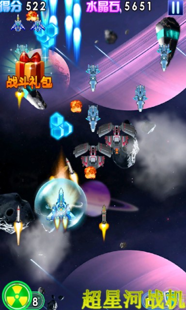 《超星河战机》是2D飞行游戏的经典射击类代表作,在画面、操作性和音效都表现出较高的水平。不论你是否是第一次接触这类游戏,相信你都能很好的把控战机!