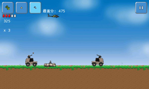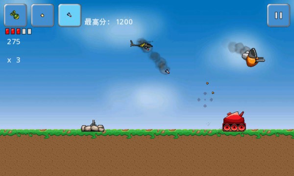 时空空战,快来驾驶武装直升机,去消灭地上的坦克、炮塔、装甲车及敌人的战机。炸弹、重机枪、火箭弹等多种武器模式任你选择!震撼爽快的必杀爆炸,堪比街机的流畅画面!纯绿色、全操作提示:滑动直升机方向就是操纵飞机的飞行方向,点击屏幕位置就是射击敌人的方向。