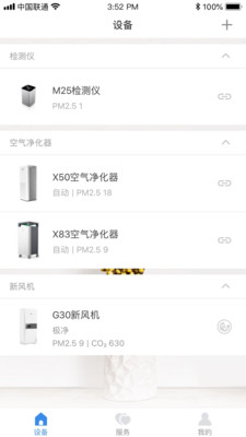 【352Air】可将352品牌的【M25检测仪】、【X83系列空气净化器】、【X50系列空气净化器】、【G30新风净化机】等产品通过Wi-Fi接入互联网,实现远程查看和智能操控,还可使空气净化器与检测仪、新风机之间实现联动净化,同时还具备在线服务和社交分享等功能。