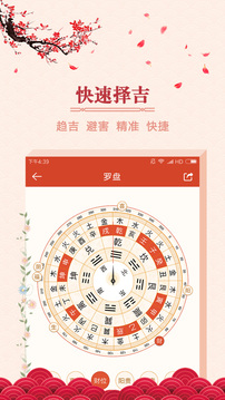 快速择吉:干支五行八卦罗盘、吉神凶煞方位罗盘、民用七十一事吉日自助择选、每日吉时自助择选等。