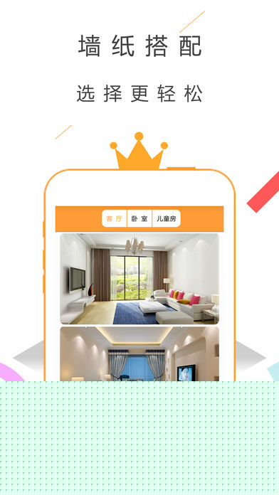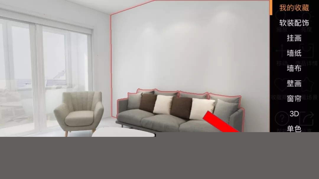 打开墙纸秀APP,在“墙纸搭配”子功能中选择一个房间场景,点选墙面,下方会弹出可更换的墙纸商品。