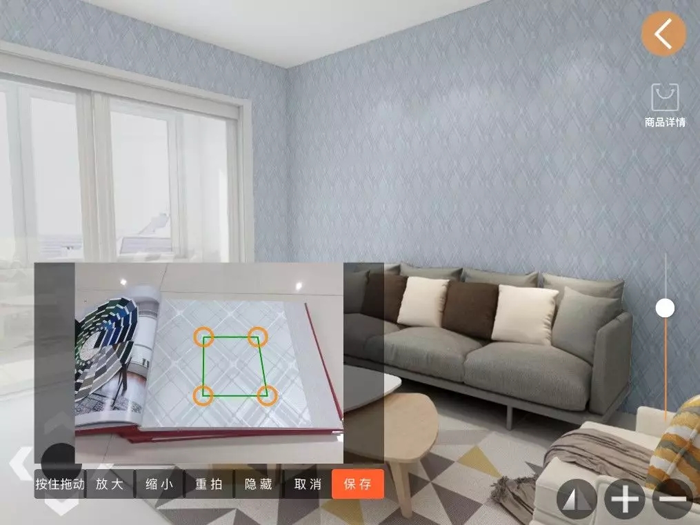 在导入墙纸样本实拍图片后,需要用4个橙色的圆圈来做4点定位,标识出最少一个完整花型。在做4点定位时,会出现放大镜辅助工具,让定位更清晰更精准。随着四个定位点的挪动,底层墙面上会自动地循环铺贴这四个点所框选出的花型,展示满屋铺贴的效果。预览满铺的实时变化,再快速微调四个点的定位,很快就能生成一个理想的墙纸单元图。随后用“放大”、“缩小”来控制花距。经过“保存”以后,可以在“我的拍照”文件夹中找到和重新使用。