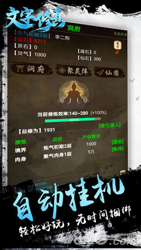 文字修真是一款以放置玩法为主的角色扮演类手机游戏。玩家在游戏中要从底层开始慢慢的修炼直至成仙成神,享受角色成长带来的成就感。游戏拥有超越十万字的原创剧情,玩家可以在游戏中自由的选择自己的生活。在玩家需要打造自身修行所需的洞府仙圃,进而渡劫飞升。有仙侣、灵宠在修行道路上的陪伴,勇闯鬼市,挑战天道之塔。修行路上会历尽艰险,随时有魔族追杀,只有飞升之日才是战争的开始。
