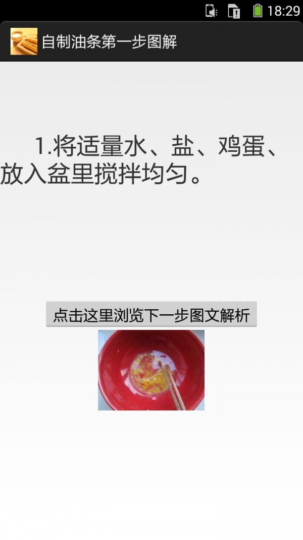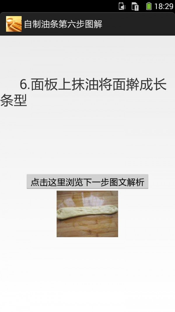 《自制油条的做法图解》手机应用介绍:可查阅到自制油条的各步骤图解做法:1.将适量水、盐、鸡蛋、放入盆里搅拌均匀;2.再加入膨松剂拌匀;3.加入面粉及酵母;4.和成面团;5.放在暖和的地方发至2倍大;6.面板上抹油将面擀成长条型......