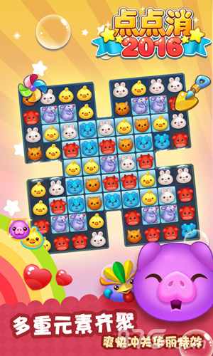 点点消2016是一款全新的消除类游戏,将可爱的动物配对以完成目标,令人着迷的特色有:6种可爱的动物会让你爱不释手,耳目一新的游戏玩法,让你应接不暇,实用又强力的道具帮助你在闯关道路上披荆斩棘,令简单上手又极富挑战的游戏风格,好友系统能够让你与好友比拼实力,一较高低。该是时候为你枯燥无味的生活,添上一抹浓墨的色彩啦!加入到我们的游戏中来吧!