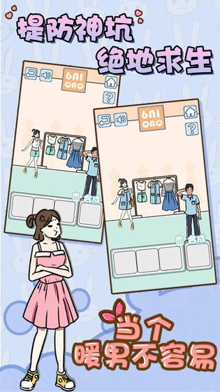 当个暖男不容易是一款非常有趣的休闲益智闯关游戏。游戏关卡丰富,包含众多送命问题,玩家在游戏中需要尽自己所能,满足女朋友的所有要求,各式有趣故事情节,卡通的画风设计,发挥你的聪明才智,考验你情商的时刻到了!