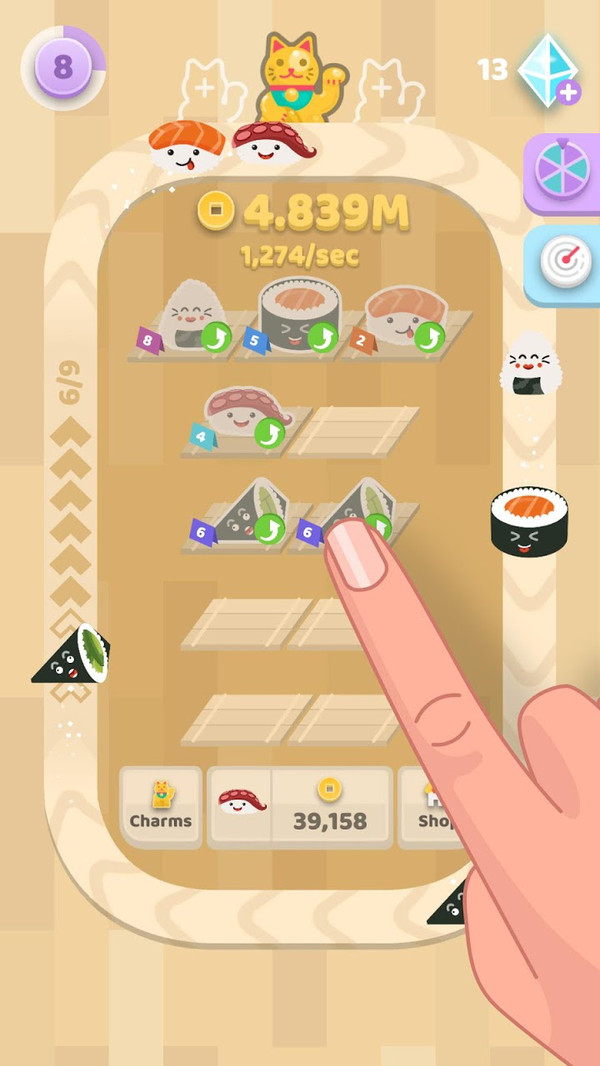 您需要合并各种迂回寿司,以便您可以合并到更先进的寿司。你也可以在这里得到额外的金币。趣味休闲游戏,饿的时候千万不要玩,寿司真的很诱人!