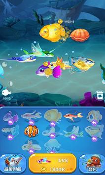 1、操作简单,将2条相同颜色的鱼合并就可以获得另一种新品类的鱼哦,合并的鱼等级越高,获取的金币就越多~渔场的收益也会越大哦。