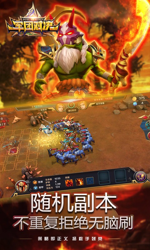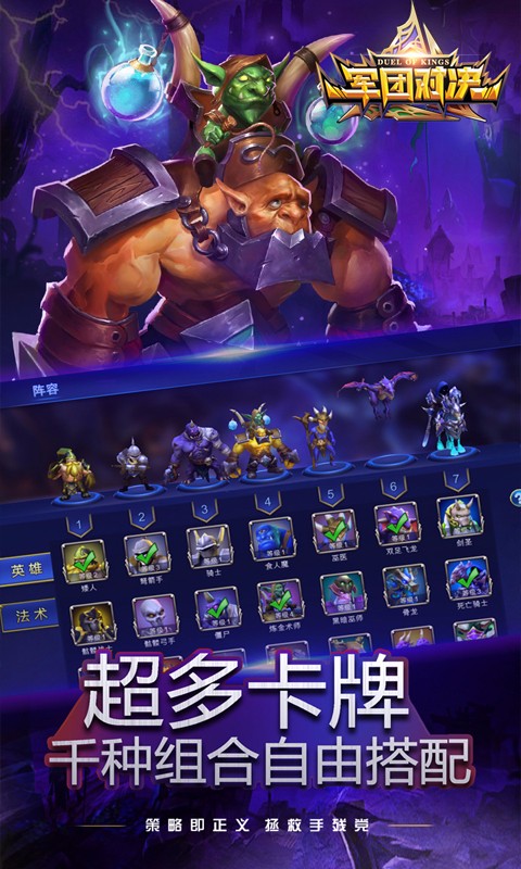 放置英雄,在统一的回合自动出兵自动战斗。在总共20个回合内,合理搭配出战英雄,并且根据对手出兵情况实时调整兵种升级树。手动施放法术卡牌增援战场,让你的军团碾压敌军!