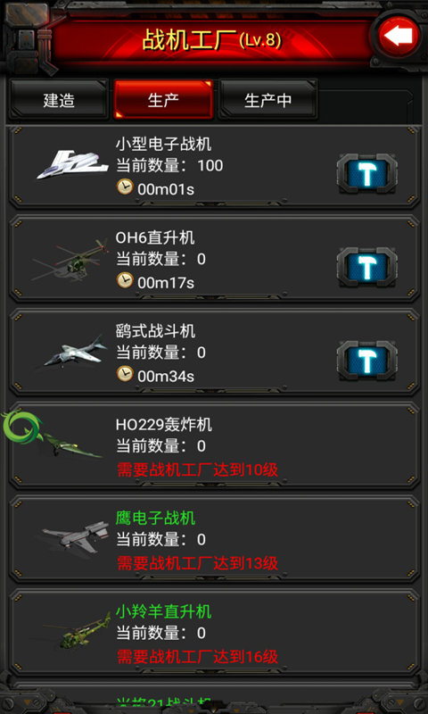 5、前期资源不是很足的话,先把战机工厂升级,尽量能生产到当前等级最大战力的战机为止,战机就是提升你战斗力一个很基本的条件。