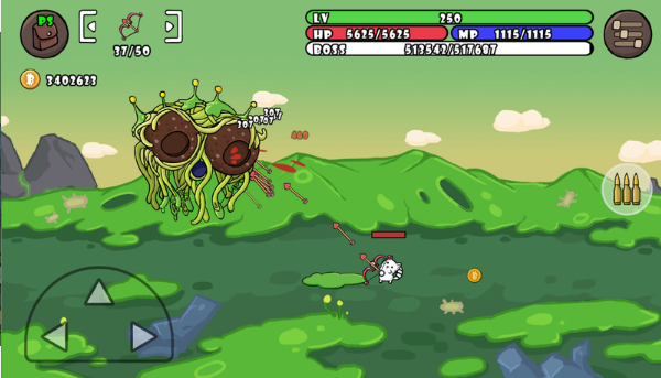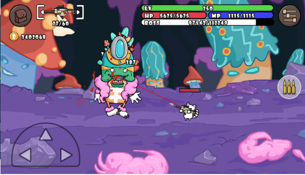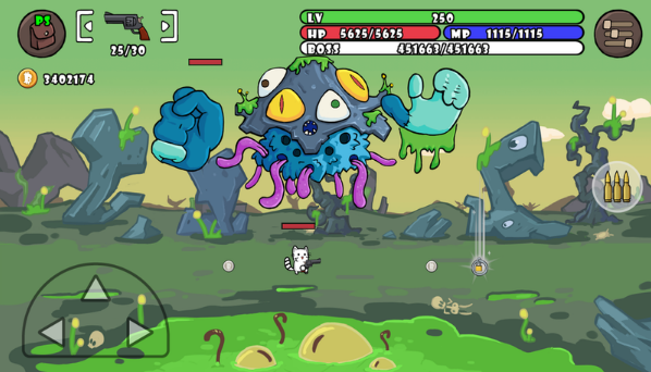 2、玩家控制小猫咪,利用猫咪手上的枪去击败我们的大怪兽。