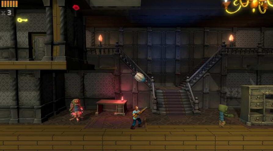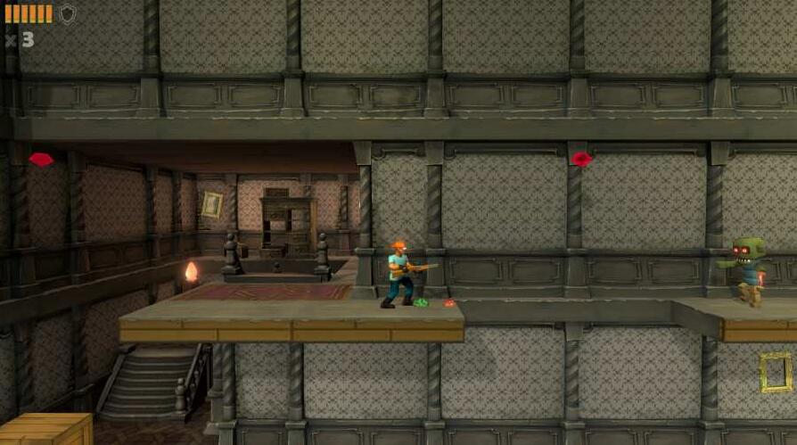 他看到了豪宅,有人偷了他的帽子。似乎是一具僵尸,他跑进豪宅,用猎枪射击僵尸。