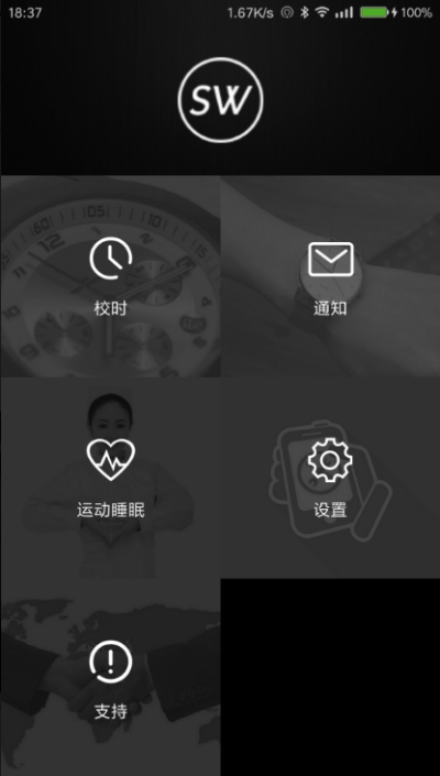 有用户设置,更新固件,更换手表,闹铃设置,查找手表,关闭和开启蓝牙,国际时区互换,运动和睡眠目标设定等功能