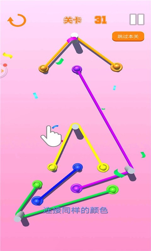 游戏操作简单易上手,是一款十分适合玩家去耐心挑战的游戏,在游戏中有着丰富的游戏关卡设计,每一关都充满了挑战性,在这里你需要灵活的调整绳子来控制绳子的方向,正确的相连即可顺利过关。
