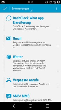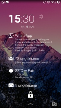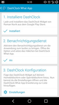 Mit dieser App erhaltet Ihr eine Erweiterung für das DashClock Widget, welche euch Informationen zu What App anzeigt.Android 4.1+ nutzt nun die Bedienungshilfe, diese muss aktiviert werden, damit die What App Nachrichten angezeigt werden. Ab Android 4.3+ wird der Benachrichtigungsdienst genutzt, welcher auch durch den Nutzer aktiviert werden muss. Die Einstellungen bieten euch einen direkten weg zu dem jeweils benötigten Service.Diese Erweiterung benötigt die Anwendung DashClock von Roman Nurik:https://play.google.com/store/apps/details?id=net.nurik.roman.dashclockWie ihr das DashClock Widget von Roman Nurik auf den Lockscreen platziert ist hier beschrieben:https://support.google.com/nexus/answer/2781801?hl=enWenn ihr kein Symbol im Launcher haben wollt, müsst Ihr leider auf die kostenpflichtige Spenden Version zurückgreifen. Viele Nutzer benötigen eine einfache Konfigurationsanleitung, weshalb wir die Anwendung zunächst im Launcher anzeigen. Die Anzeige des Symbols ist in Android leider nicht dynamisch einstellbar.https://play.google.com/store/apps/details?id=com.stallware.dashclock.whatsapp.donateBitte informiert uns bei Fehler per Email.